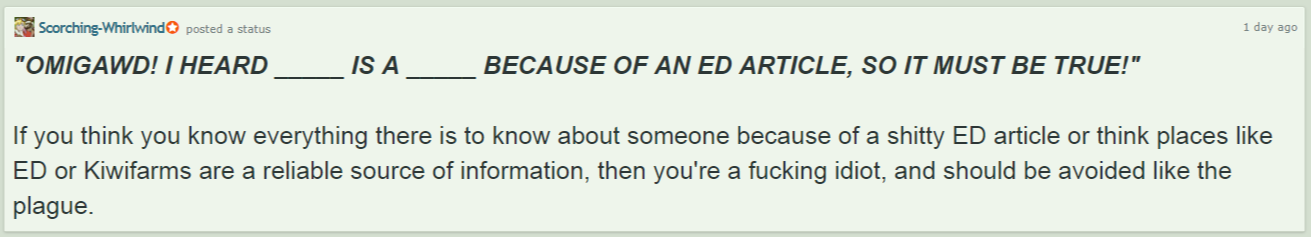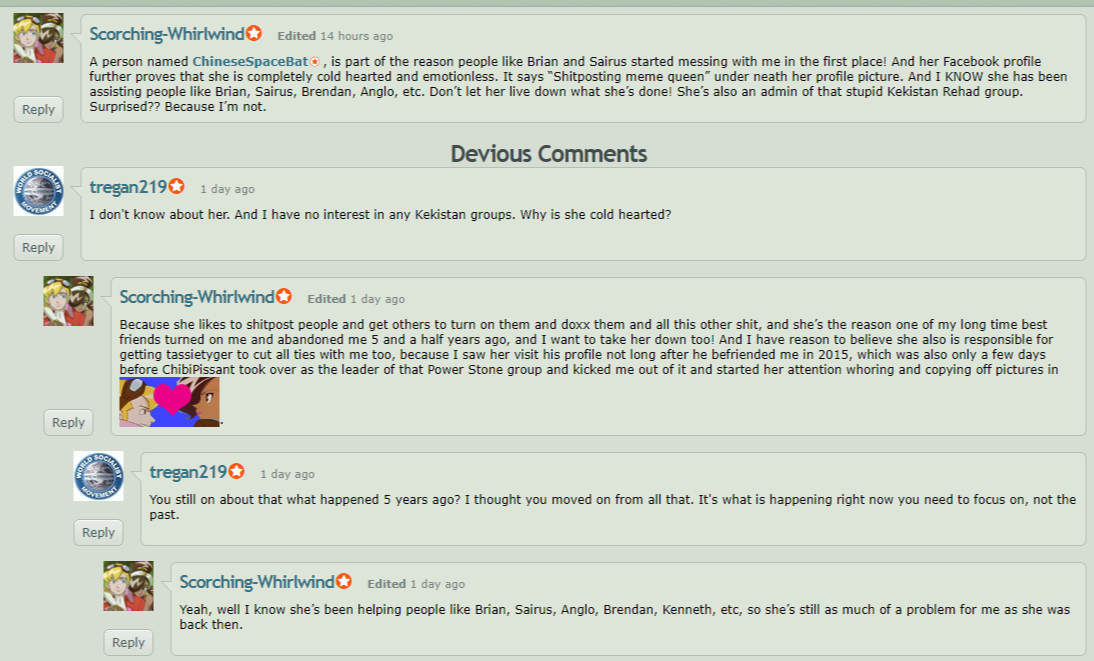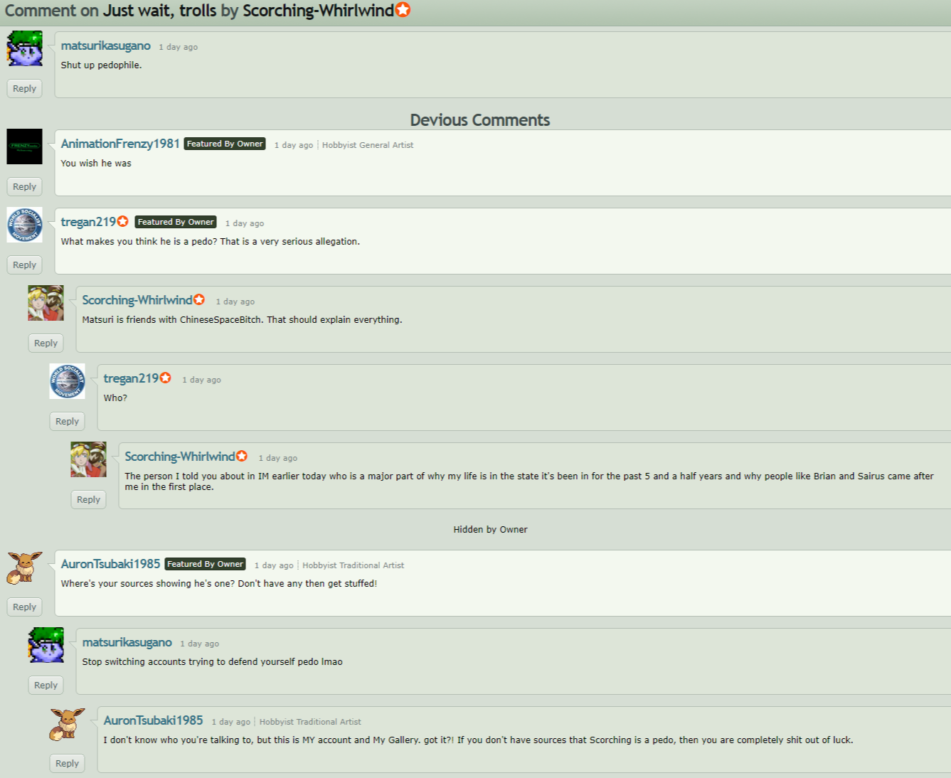 Since you all made it to this part, I will explain why I chose to call them out on Kiwi Farms. I was told by one user about the time when I made posts that got Scorching-Whirlwind's attention on DeviantArt. I figured that since I know well not only Scorching-Whirlwind and Terry caused enough damage online, it is also their associates such as Ga-Maleven, TheMightyShockwave, AuronTsubaki1985, TheHumbleCritic, autismruinedda, AlabamaFibber and Zeit.