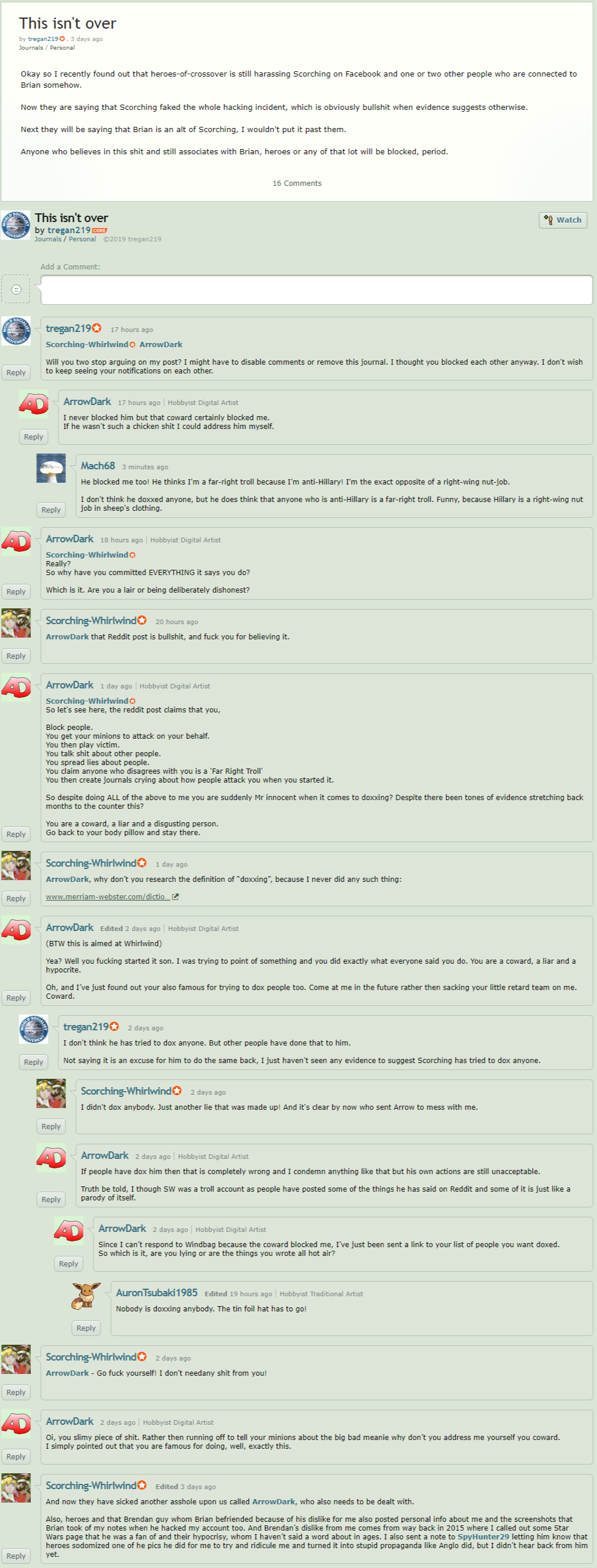 It didn't help that Fox kept further escalating the issue by basically taunting the doxxer. I actually had to leave DeviantArt for some time because I kept getting hate mail in my inbox because of his journal, and a death threat. Fox made no step to end all of this chaos until now. But even then his other commentaries remain and the doxxers could still be lurking on his page... who knows. It's frightening. I am just glad that he removed his journal so I can finally get peace. From now on I am remaining 100% drama free.